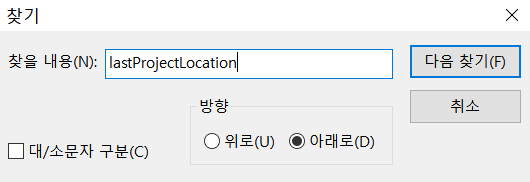 그 후, Ctrl + F를 입력하여 찾기창을 띄운 후 "lastProjectLocation" 을 찾아줍니다.