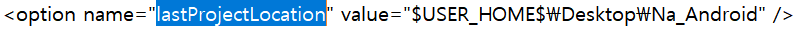 lastProjectLocation을 찾은 후, value의 값을 자기가 원하는 경로로 수정해줍니다. 여기서 $USER_HOME$은 환경변수에 설정된 값인데, 기본적으로 C:\사용자\사용자이름 으로 셋팅되어있습니다. 저 같은 경우에는 Desktop의 Na_Android 폴더를 설정해 주었습니다. 이제 새로운 프로젝트를 만들 때 저 폴더로 들어가게 됩니다.